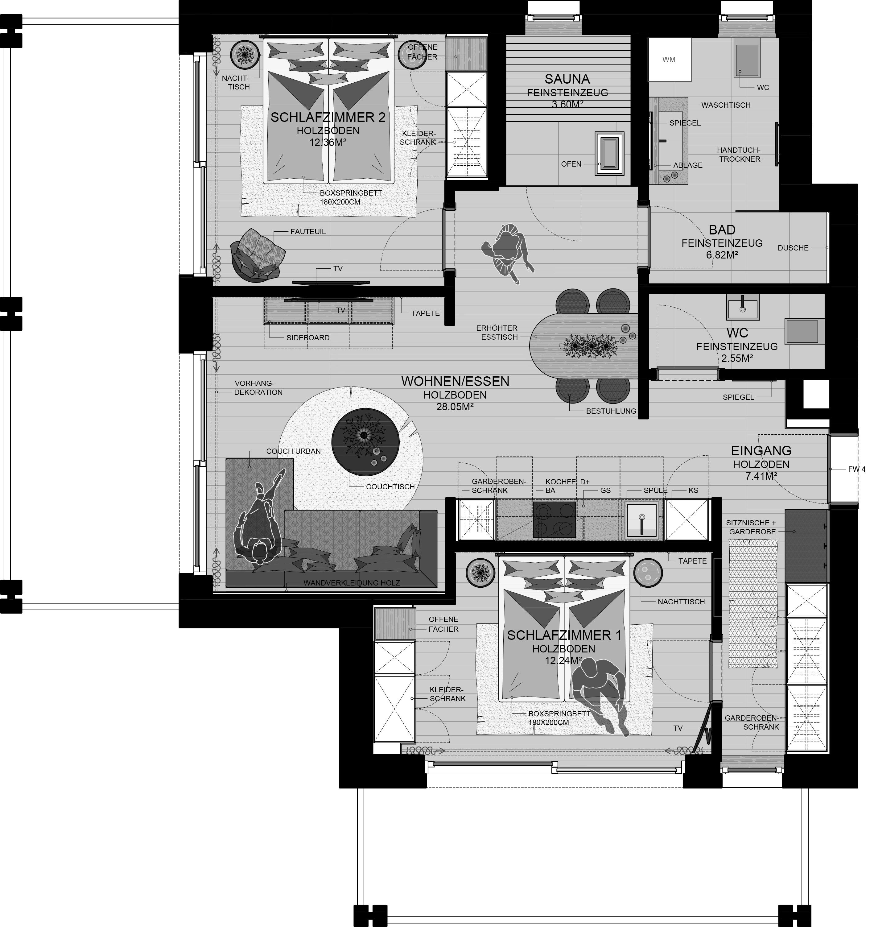 Ein besonderes Highlight der Wohnung ist die eigene Sauna, in der Sie nach einem aktiven Tag in den Bergen wunderbar entspannen können. Das Badezimmer ist modern ausgestattet und verfügt über Dusche, Handtuchtrockner und Föhn. Zusätzlich steht ein separates WC zur Verfügung.