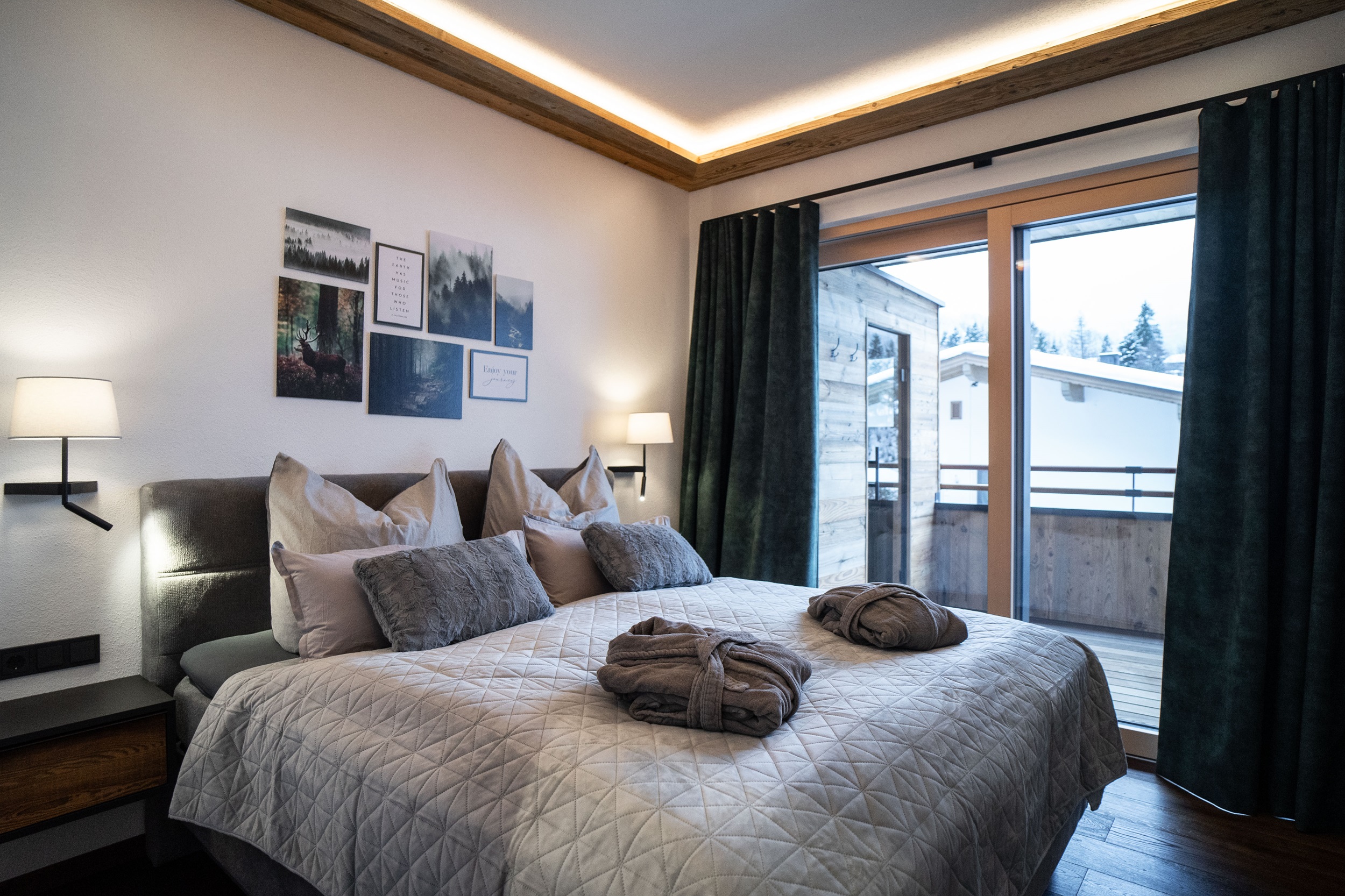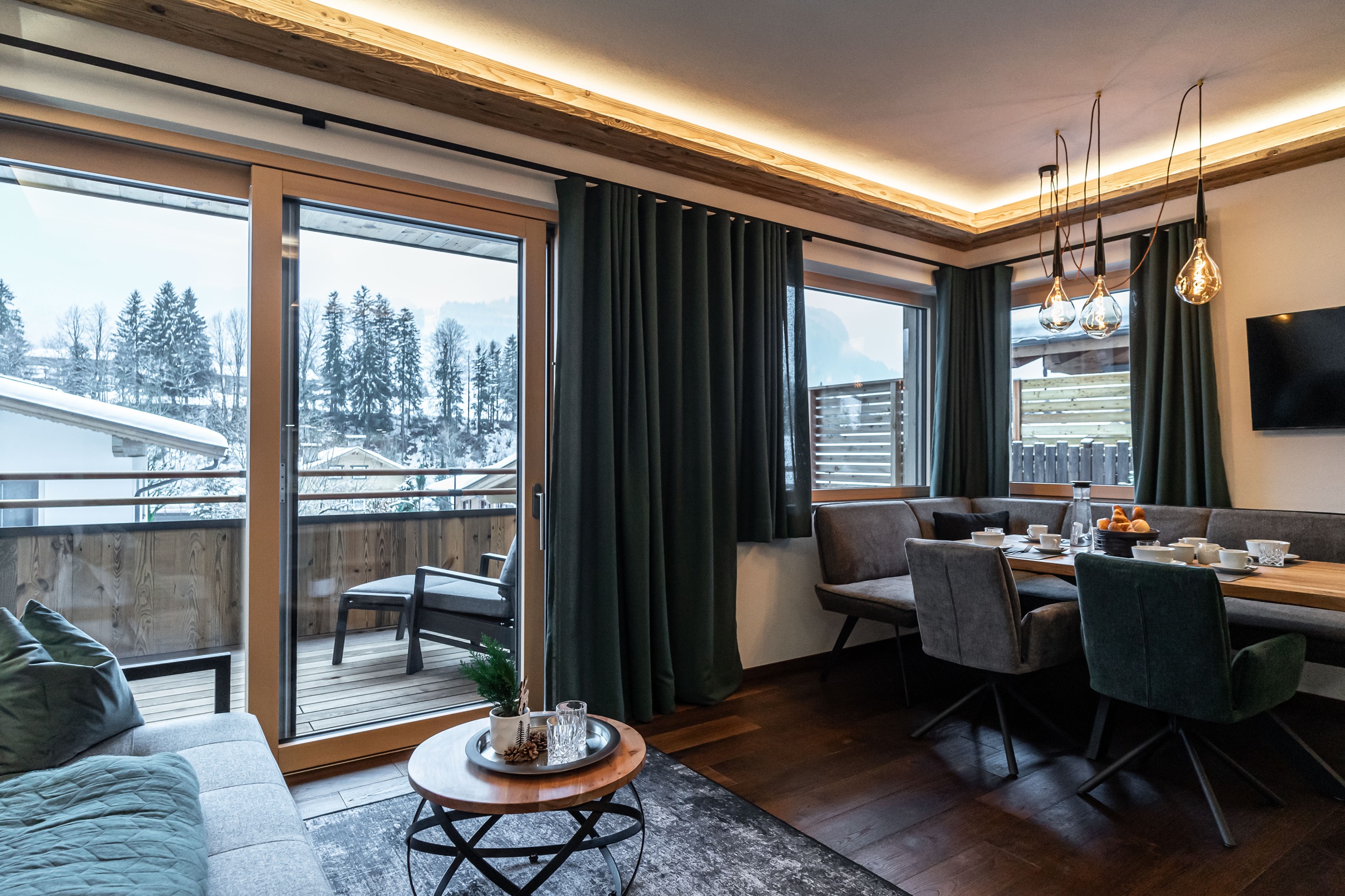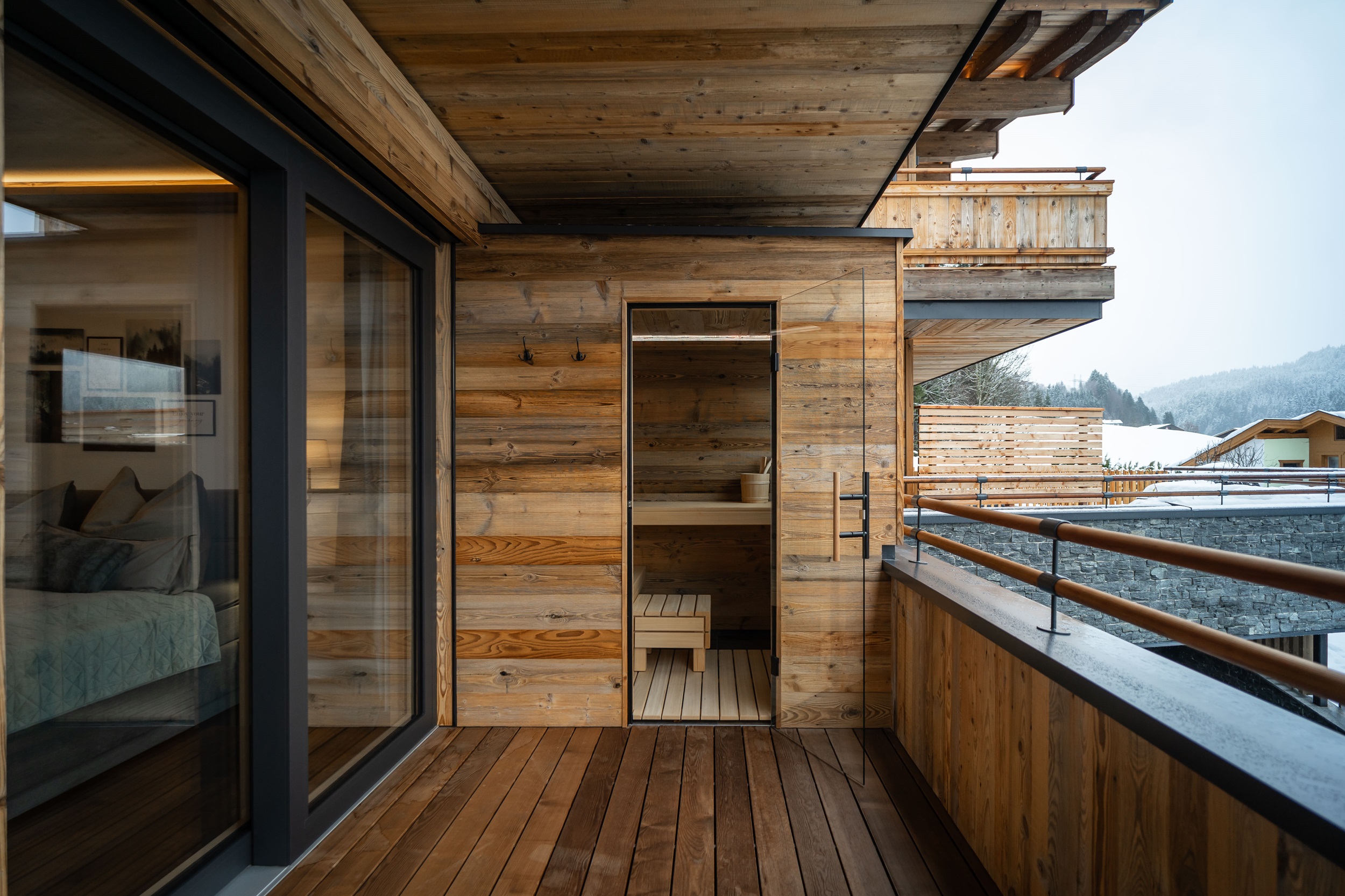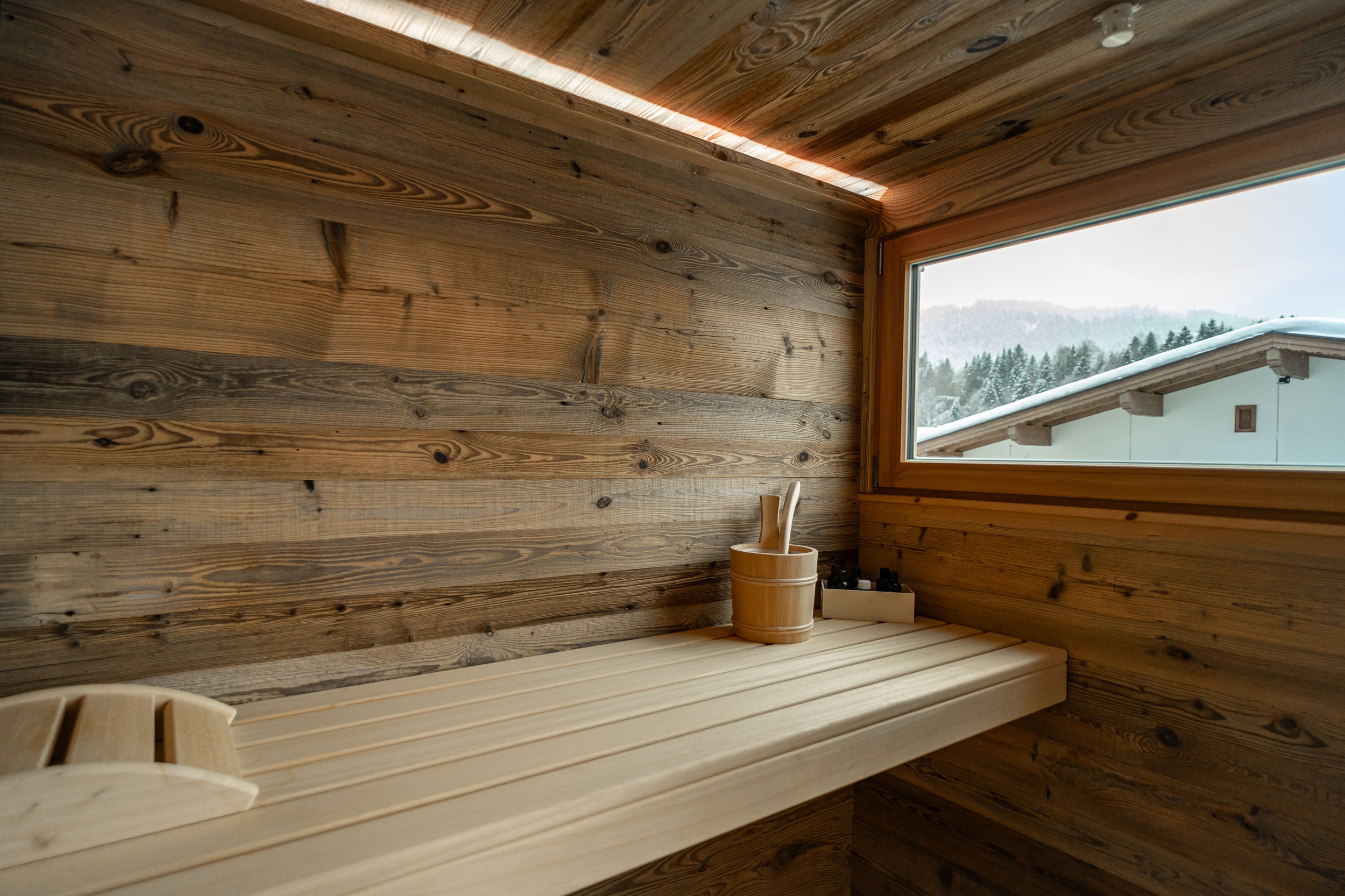 In unserer Panorama-Ferienwohnung im ersten Stock erwartet Sie ein fantastischer Ausblick und ein besonderes Highlight: eine private Balkon-Sauna. Die Urlaubsunterkunft bietet auf 43 m² genügend Platz für eine erholsame Auszeit in Fieberbrunn im PillerseeTal. Im Schlafzimmer finden Sie ein gemütliches Boxspringbett sowie einen Fernseher vor. Im Badezimmer befindet sich ein WC, eine Regendusche, ein Handtuchtrockner und ein Föhn. Wir stellen Ihnen zudem Handtücher, Bettwäsche, Seife, Toilettenpapier und Toiletten-Artikel zur Verfügung. Im Wohn-Esszimmer können Sie einen erfolgreichen Urlaubstag mit Ihren Liebsten ausklingen lassen. Dieser Bereich der Wohnung ist mit einem Esstisch samt Eckbank, einem Fernseher und einer ausziehbaren Couch für 2 Personen eingerichtet. Die Küche ist voll ausgestattet mit einem Kühlschrank mit Gefrierfunktion, Backofen, Geschirrspüler, Herd, Nespresso-Kaffeemaschine, Toaster, Wasserkocher, Pürierstab, Mixer, Messerblock und vielem mehr. Auf dem eigenen Balkon befindet sich nicht nur die Privatsauna, sondern auch Liegestühle, damit Sie die herrliche Aussicht so richtig genießen können. Selbstverständlich bieten wir unseren Gästen kostenfreies WLAN an und Netflix sowie Kabelfernsehen sorgen für zusätzliche Unterhaltung in Ihren Ferien in Tirol. Nutzen Sie gerne den Garagenparkplatz und im Winter können Sie Ihre Ski- und Snowboard-Ausrüstung im hauseigenen Skiabstellraum sicher aufbewahren. Hier finden Sie außerdem einen Skischuhtrockner vor.